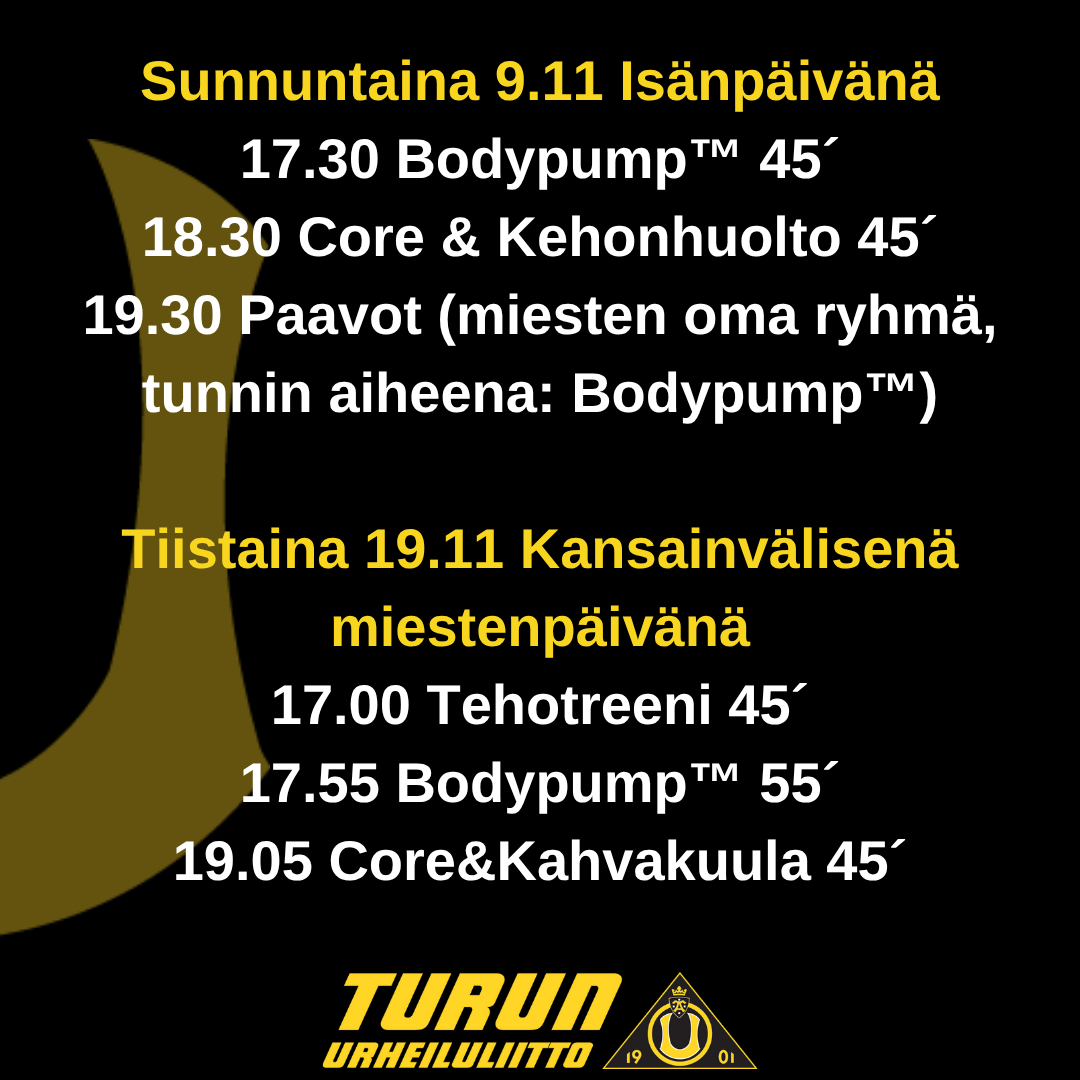 9.11 Isänpäivänä ja 19.11 Kansainvälisenä miestenpäivänä, miehet ilmaiseksi tunneille