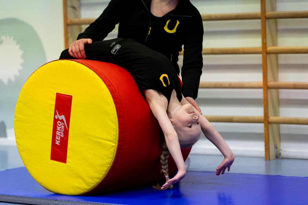 "Juokse, laukkaa, hypi, tasapainoile, kieri, tee kuperkeikka." Voimistelukoulussa harjoitellaan voimistelunperustaitoja välineiden kanssa, musiikin tahtiin ja hauskojen leikkien lomassa. Tiesitkö, että kuperkeikan voi oppia ensin tekemällä kilpikonnakelluntaa, tai käsiseisontaa voi harjotella tekemällä "lahjapaketin" seinää vasten?