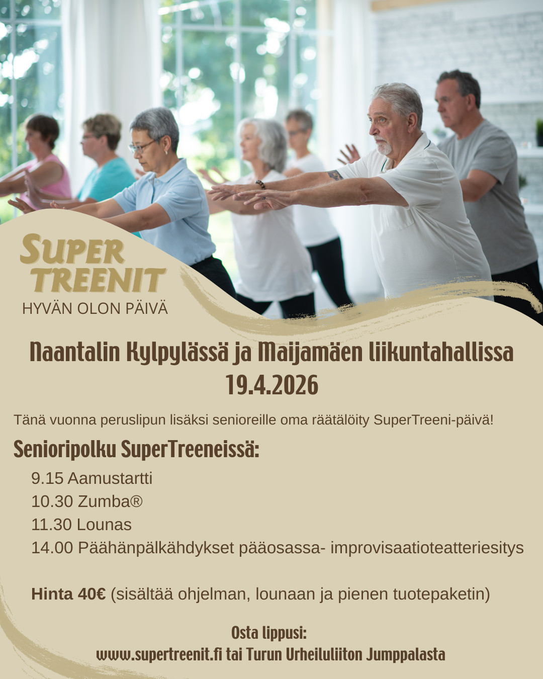 SuperTreenit tapahtumassa sunnuntaina 19.4. oma yli 60-vuotiaiden Senioripolku. Lue lisää ja tule mukaan! www.supertreenit.fi Tuotepaketissa mukana tuotteita kotiin, hiuksille, vartalolle ja jaloille.